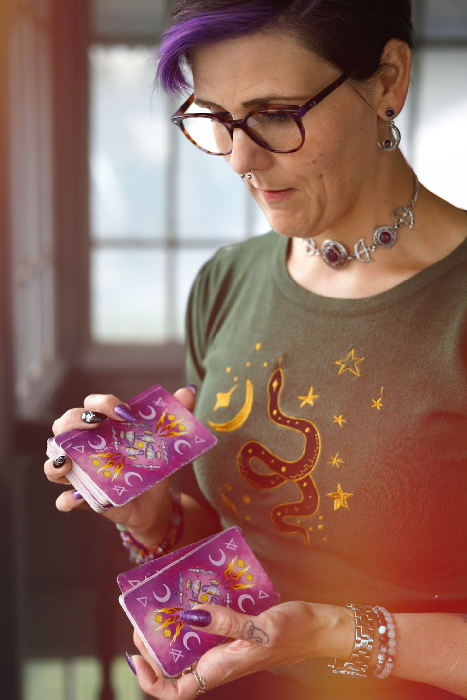 Jeg er Ragna – tarotekspert, podcaster, kursleder og moderne heks med sans for både symbolikk og sjokolade 🍫✨ Tarot har vært en veldig viktig del av livet mitt i siden 2016, og det gir meg så mye glede å få hjelpe andre med å finne sin stemme og styrke gjennom kortene.